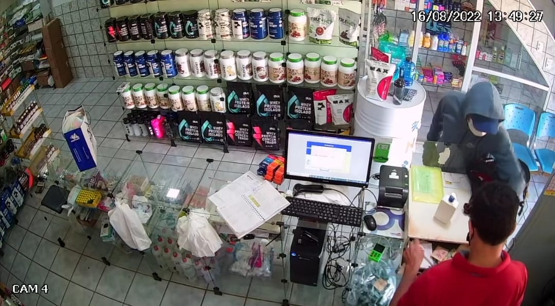 Em seguida, o assaltante pede para o farmacêutico ir para os fundos do estabelecimento. Ao entrar em um cômodo da farmácia em busca de mais bens para roubar, a vítima consegue sair do local e fechar a porta de vidro.
