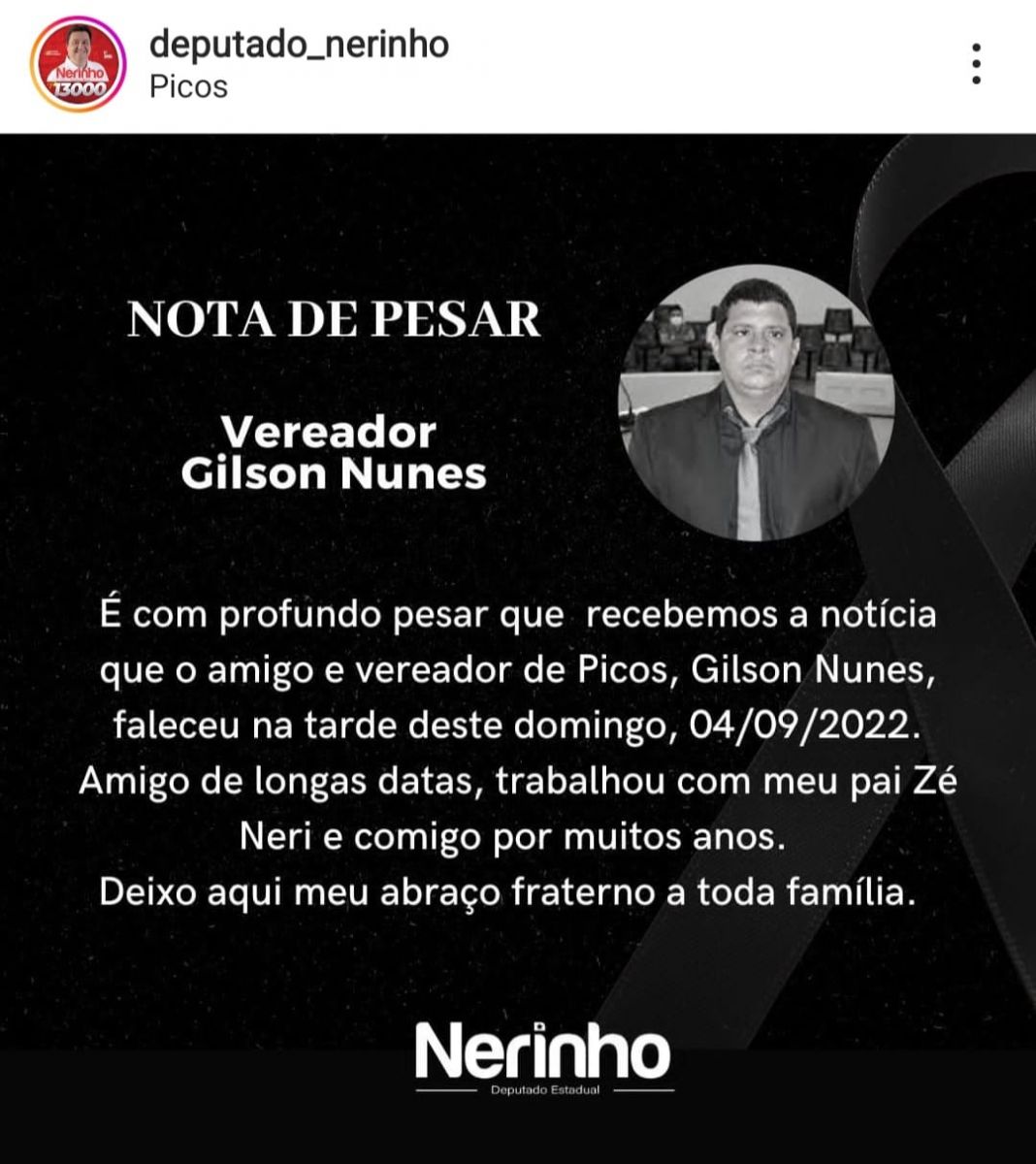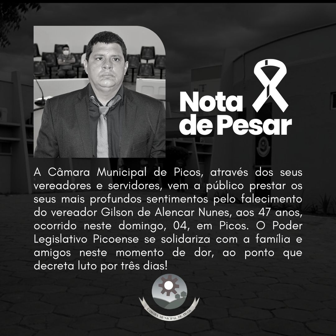 A Câmara de Vereadores de Picos, através do presidente, Francisco das Chagas de Sousa, o Chaguinha, decretou luto oficial de três dias.
