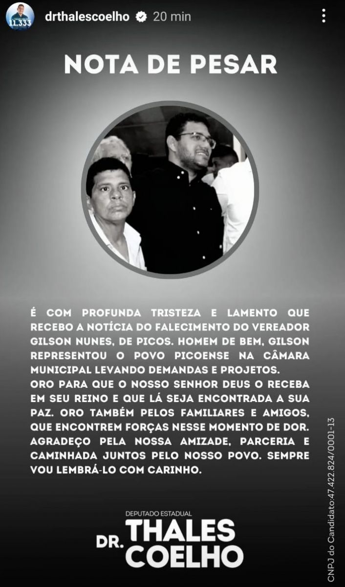 Veio a óbito na tarde deste domingo, 04 de setembro, o vereador Gilson de Alencar Nunes (PTB), aos 47 anos, ele estava internado no Hospital de Dr. Oscar, em Picos.