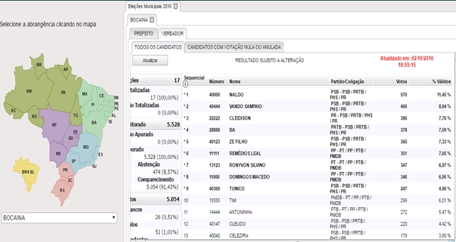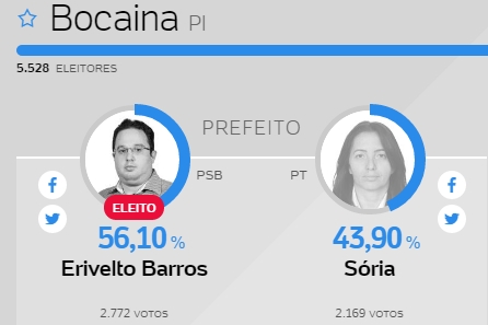 Neste domingo, 02, um total de 2772 eleitores escolheram o médico Erivelto de Sá Barros (PSB) para gerir o município de Bocaina durante os próximos quatro anos. Com 56,10% dos votos válidos representando uma maioria de 603 votos em relação a sua principal opositora.