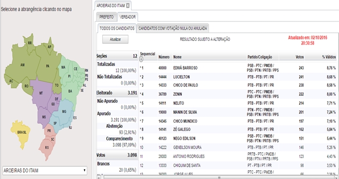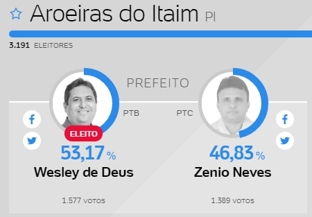 Com 1.577 votos Wesley Gonçalves de Deus (PTB), prefeito de Aroeiras do Itaim, foi reeleito e a partir do dia 01 de janeiro de 2017, irá gerir o município por mais quatro anos.
