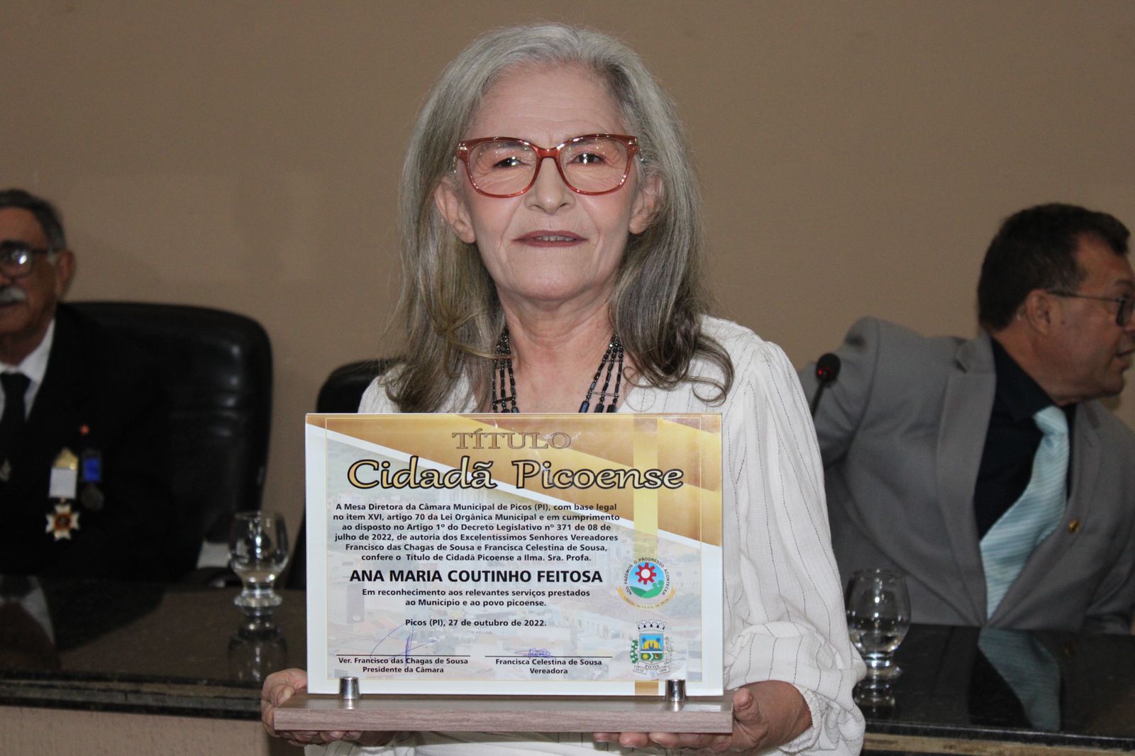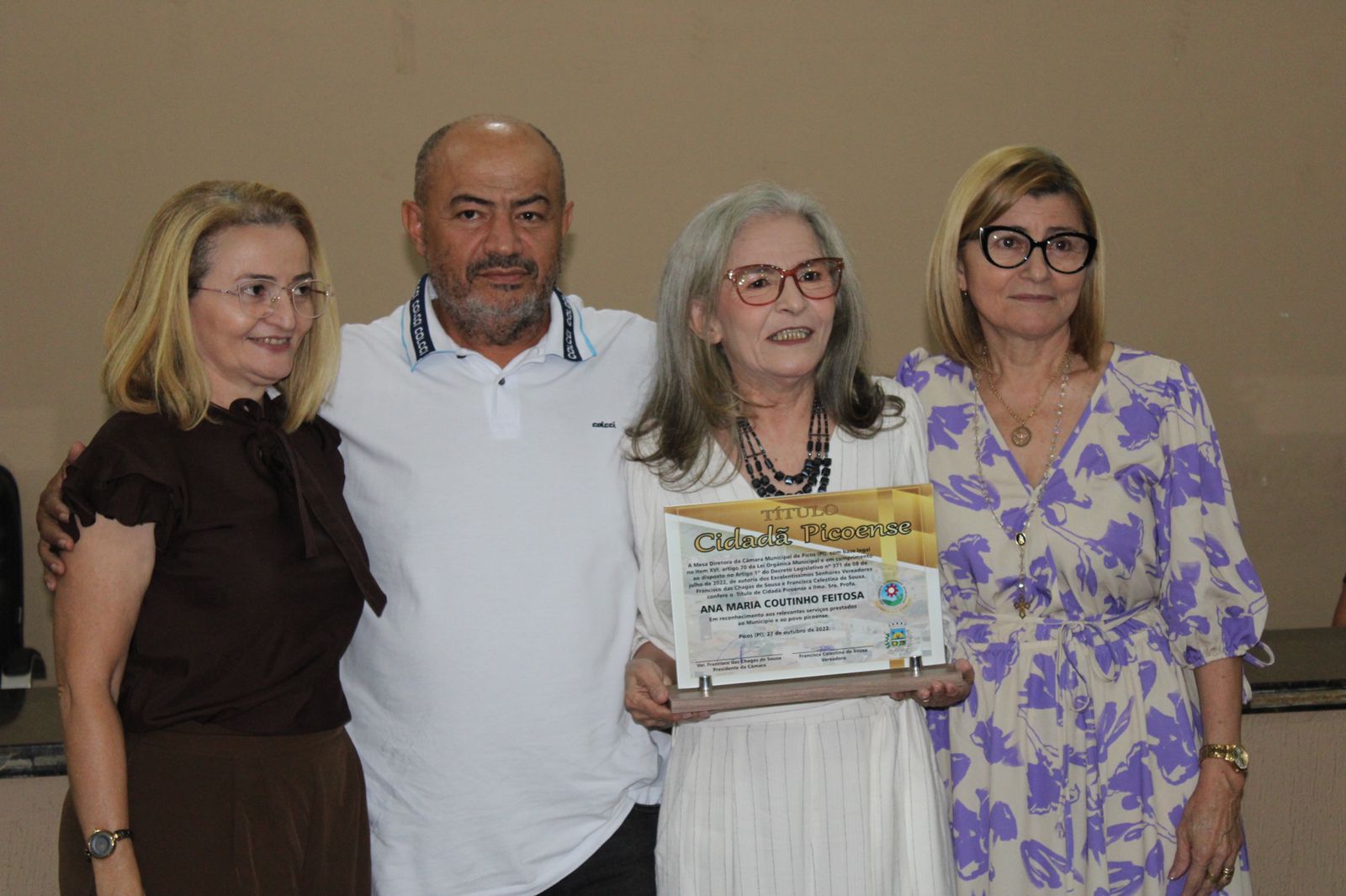 A Câmara Municipal de Picos realizou sessão solene na noite desta quinta-feira, (27), para a entrega do título de cidadania para a professora Ana Maria Feitosa Coutinho.