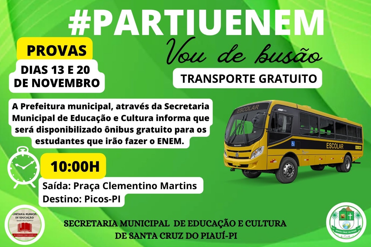A Prefeitura de Santa Cruz do Piauí, através da Secretaria de Educação e Cultura, vai disponibilizar transporte gratuito para os estudantes inscritos no Exame Nacional do Ensino Médio (Enem).