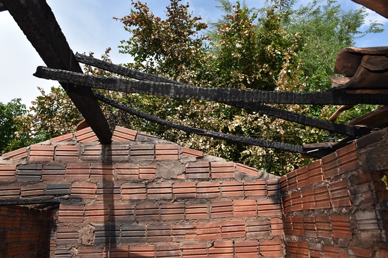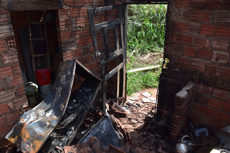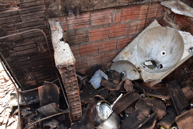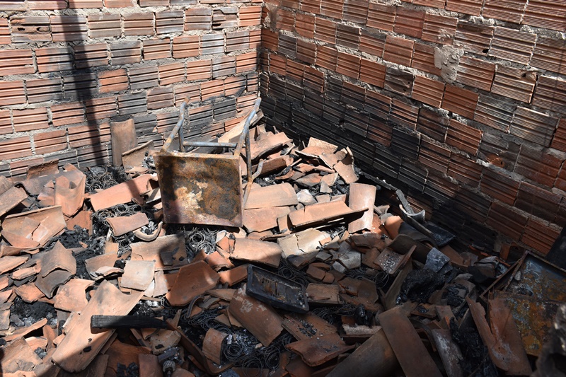 O teto da casa desabou devido as chamas, no local é possível ver o que sobrou do incêndio, geladeira, cama, fogão e demais itens da residência foram totalmente destruídos.