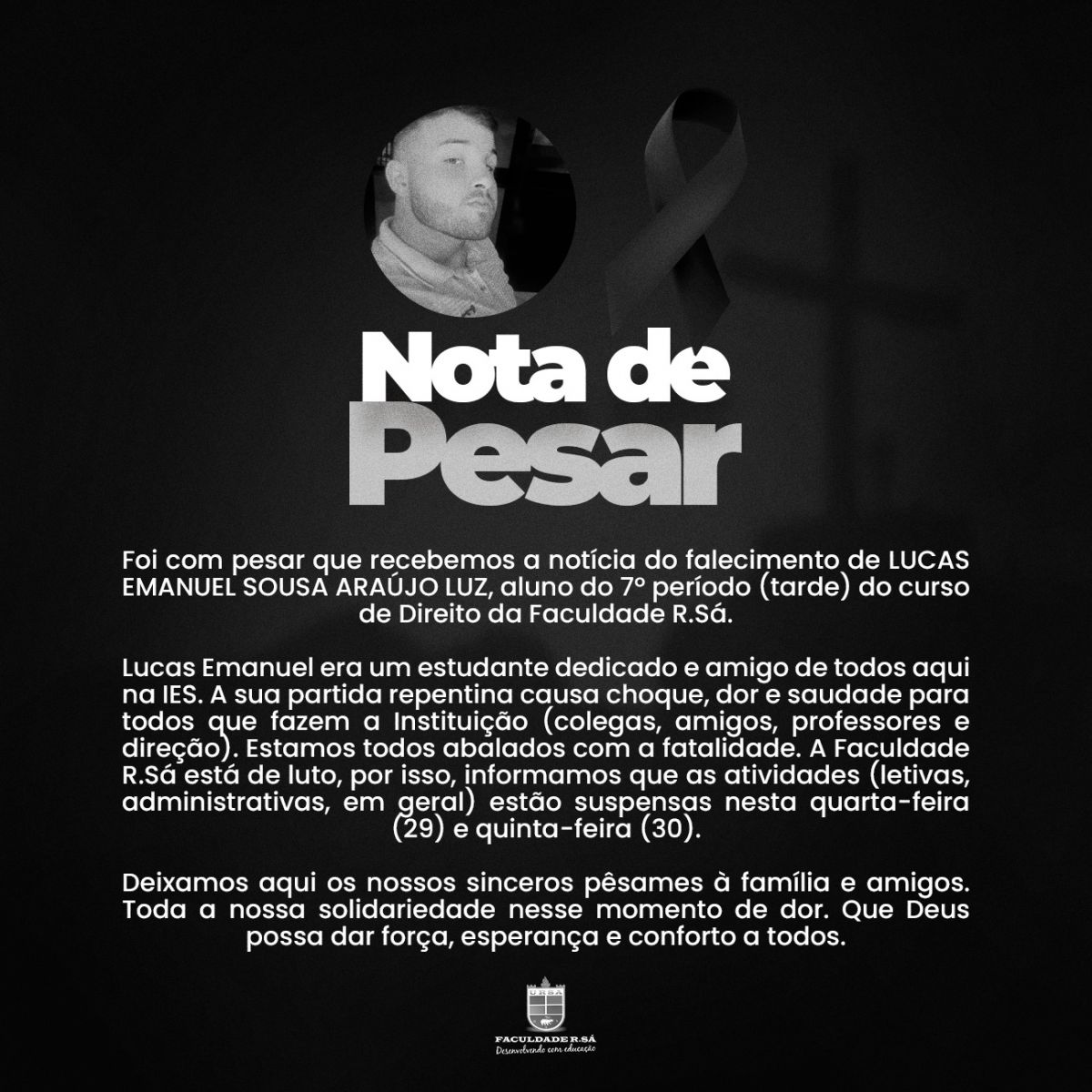 O jovem residia na Rua Juscelino Araújo no bairro Ipueiras. A Faculdade R.Sá divulgou nota em que lamenta a morte do jovem e suspende as atividades na quarta e quinta-feira.