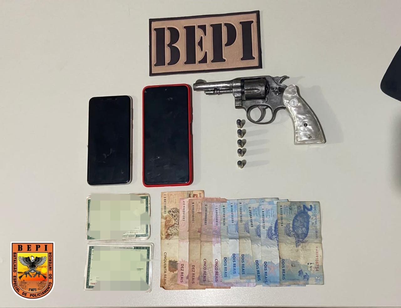 Com um dos acusados foram encontrados um revólver Taurus calibre 12, cinco munições intactas, R$ 92,00 em espécie e dois aparelhos celulares.