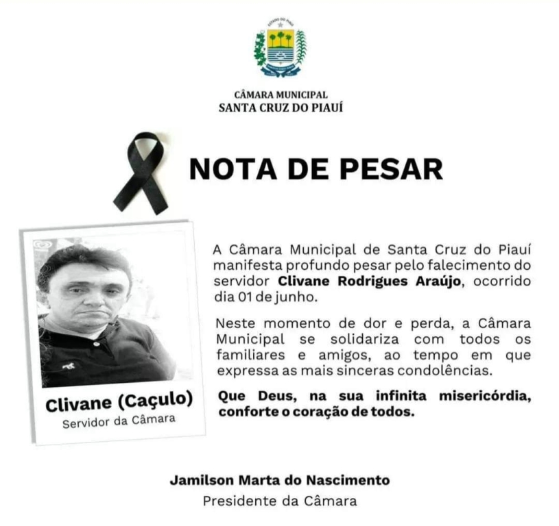 Faleceu no início da tarde de ontem, dia 1º de junho, o servidor da Câmara Municipal de Santa Cruz do Piauí, Clivane Rodrigues Araújo. A causa da morte não foi divulgada. Ele era auxiliar administrativo da câmara há vários anos e sua marte foi lamentada pelo presidente da Casa, vereador Jamilson Marta do Nascimento, que prestou sua solidariedade à família enlutada por meio de Nota de Pesar.