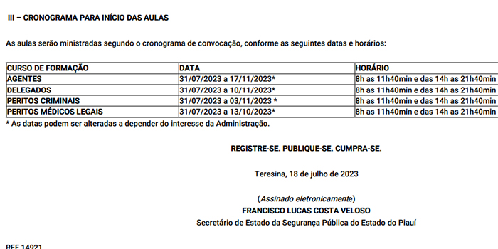 No edital de convocação o secretário explicou que o Curso de Formação é o requisito para investidura nos cargos da Polícia Civil. As aulas serão ministradas na Academia de Polícia Civil, na zona Sul de Teresina, exigindo-se do aluno frequência obrigatória, com atividades que poderão se desenvolver nos turnos diurno e noturno, inclusive nos fins de semana e feriados.