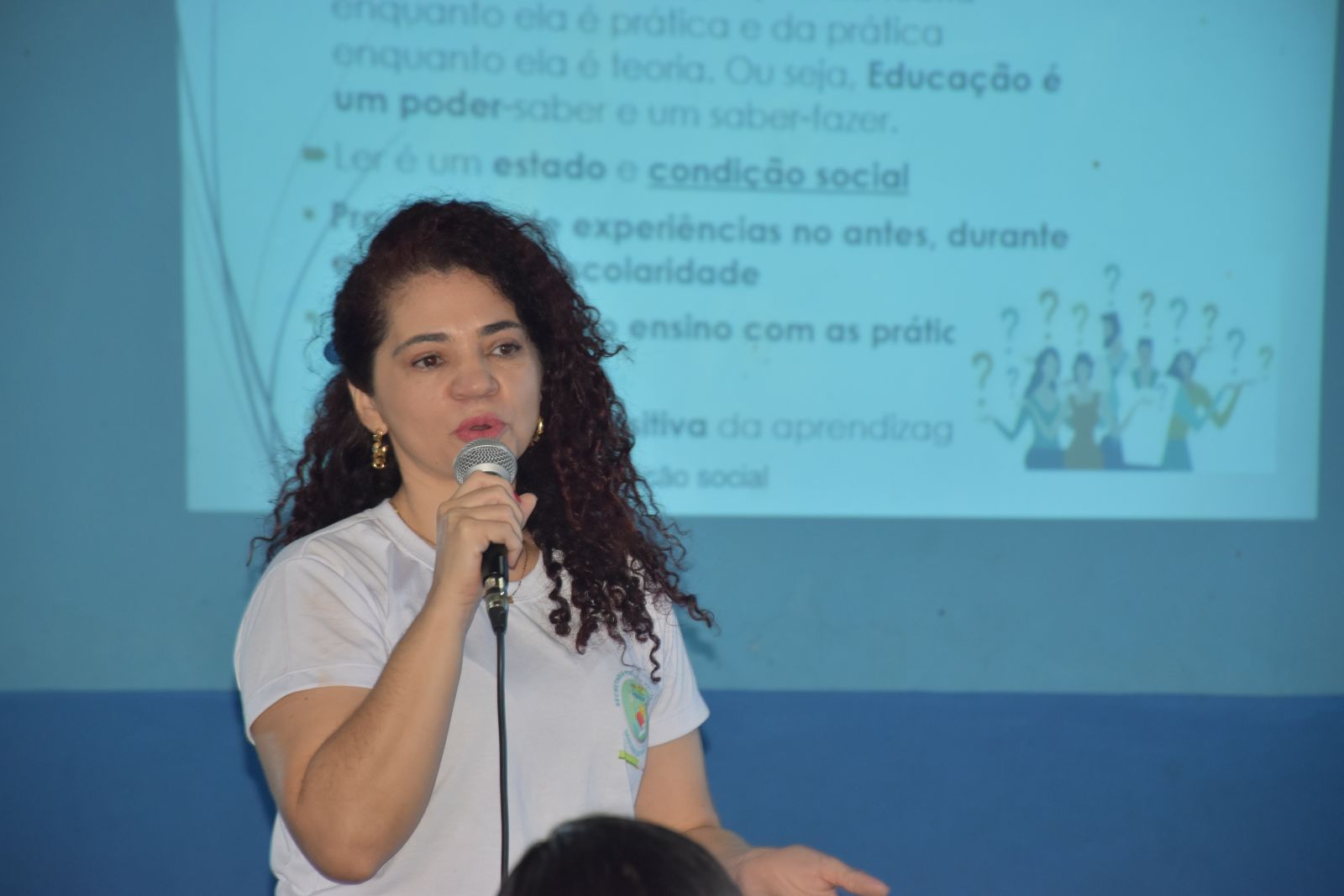 No Encontro Pedagógico, foram realizadas palestras formativas, sendo a primeira ministrada pela técnica, Ana Patrícia, que explicou os assuntos abordados no evento e apresentou o método de ensino que será inserido nas atividades educacionais.