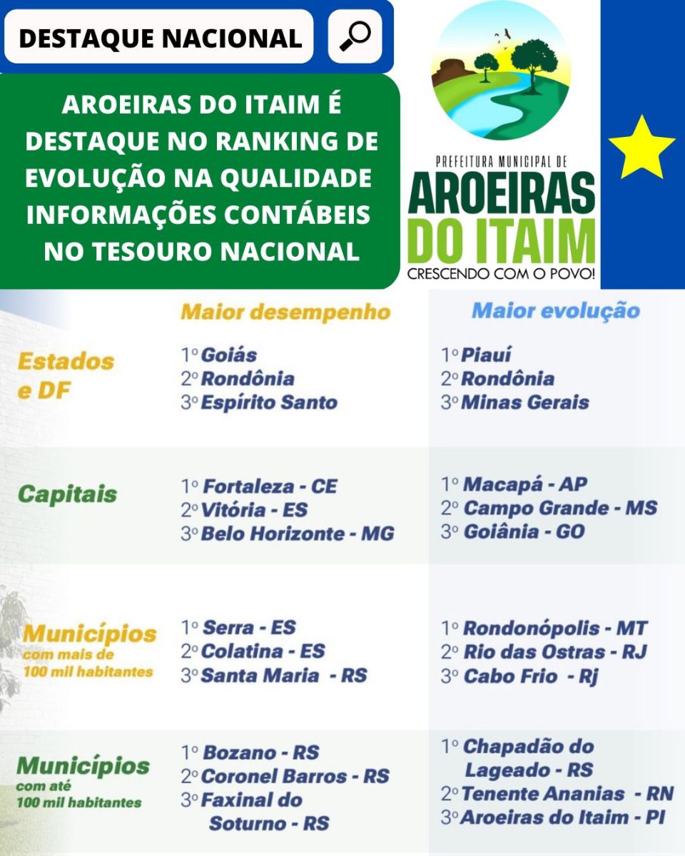 Aroeiras do Itaim também é destaque, desta vez nacionalmente, no Ranking de Evolução na Qualidade das Informações Contábeis junto ao Tesouro Nacional, na categoria Maior Evolução.