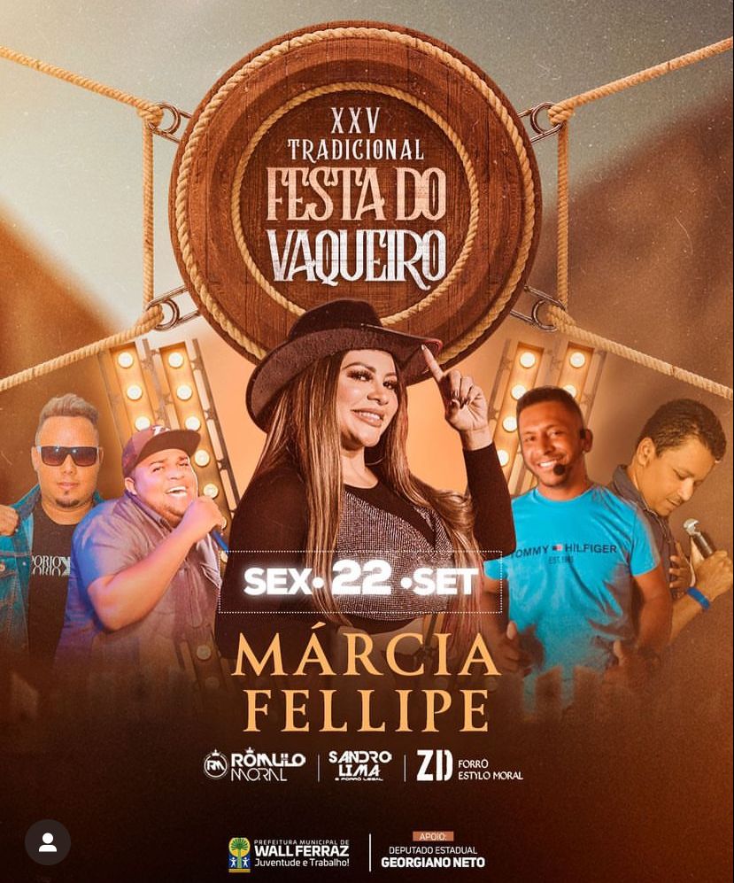 O prefeito de Wall Ferraz, Guilherme Maia, também conhecido por ‘Galeguinho Trabalhador’, já havia anunciado no início deste mês de setembro, a cantora Márcia Fellipe para a tradicional Festa do Vaqueiro, que acontecerá no próximo dia 22 de setembro.
