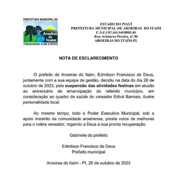 A Prefeitura de Aroeiras do Itaim publicou nesta quinta-feira, 26, um comunicado em que informa a suspensão das festividades em comemoração ao aniversário da cidade