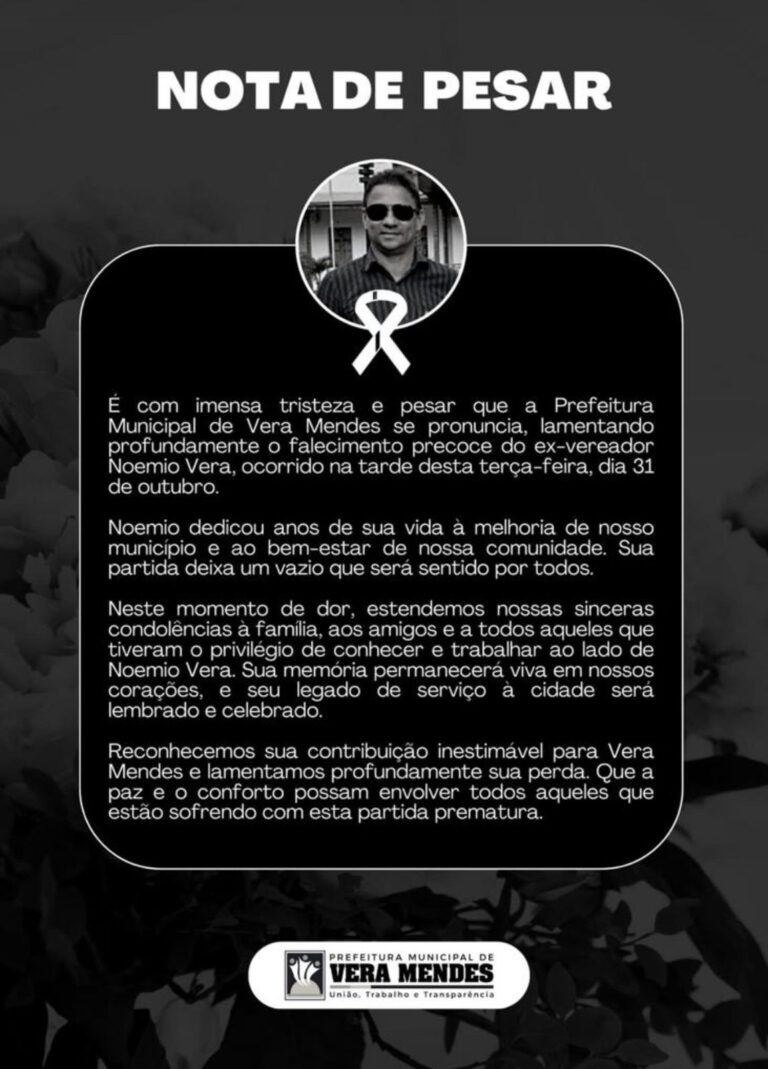 O prefeito do município de Vera Mendes, Carlos José da Silva, o Carlim, divulgou uma Nota de Pesar em que lamenta a morte do ex-vereador Noêmio Vera, destaca a dedicação do mesmo ao município e presta solidariedade aos familiares e amigos.