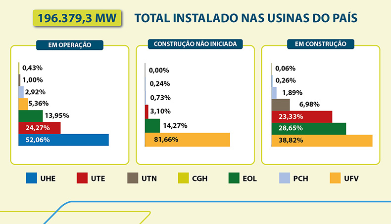 O Brasil somou 195.718,1 MW de potência fiscalizada, de acordo com dados do Sistema de Informações de Geração da ANEEL, o SIGA, atualizado diariamente com dados de usinas em operação e de empreendimentos outorgados em fase de construção. Desse total em operação, ainda de acordo com o SIGA, 83,8% das usinas são consideradas renováveis.