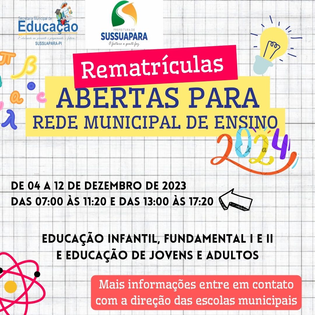 As rematrículas seguem até o dia 12 de dezembro. A Secretaria de Educação irá divulgar a data de início para as matrículas de novos alunos, que queiram ingressar no ensino de Sussuapara.