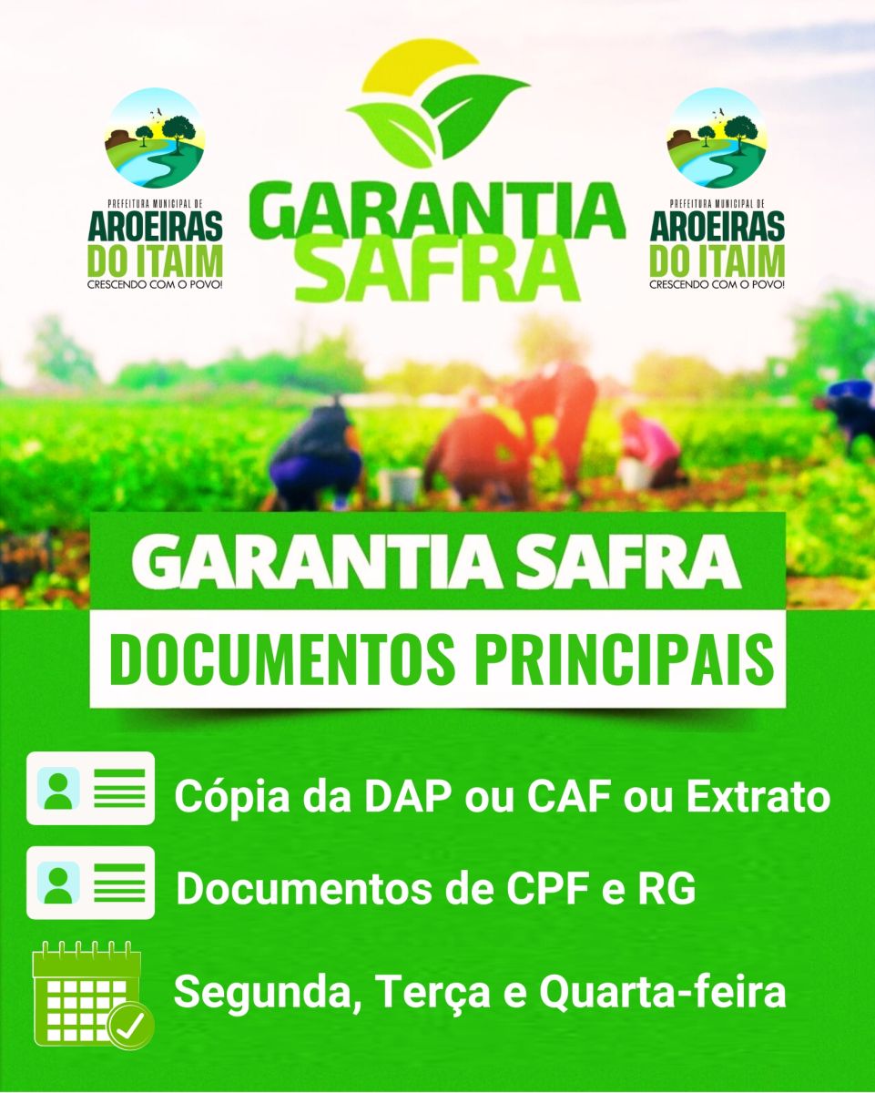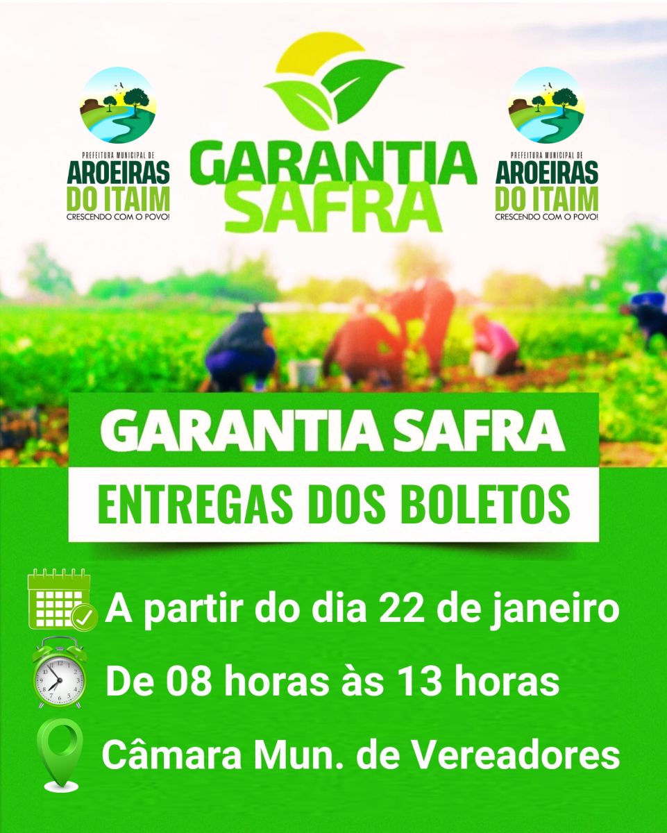 A partir de segunda-feira, (22), a Prefeitura de Aroeiras do Itaim, através da Secretaria de Agricultura, estará entregando os boletos do Garantia Safra aos agricultores e agricultoras Aroeirenses, a partir de 8h às 13 horas, na Câmara de Vereadores de Aroeiras do Itaim.