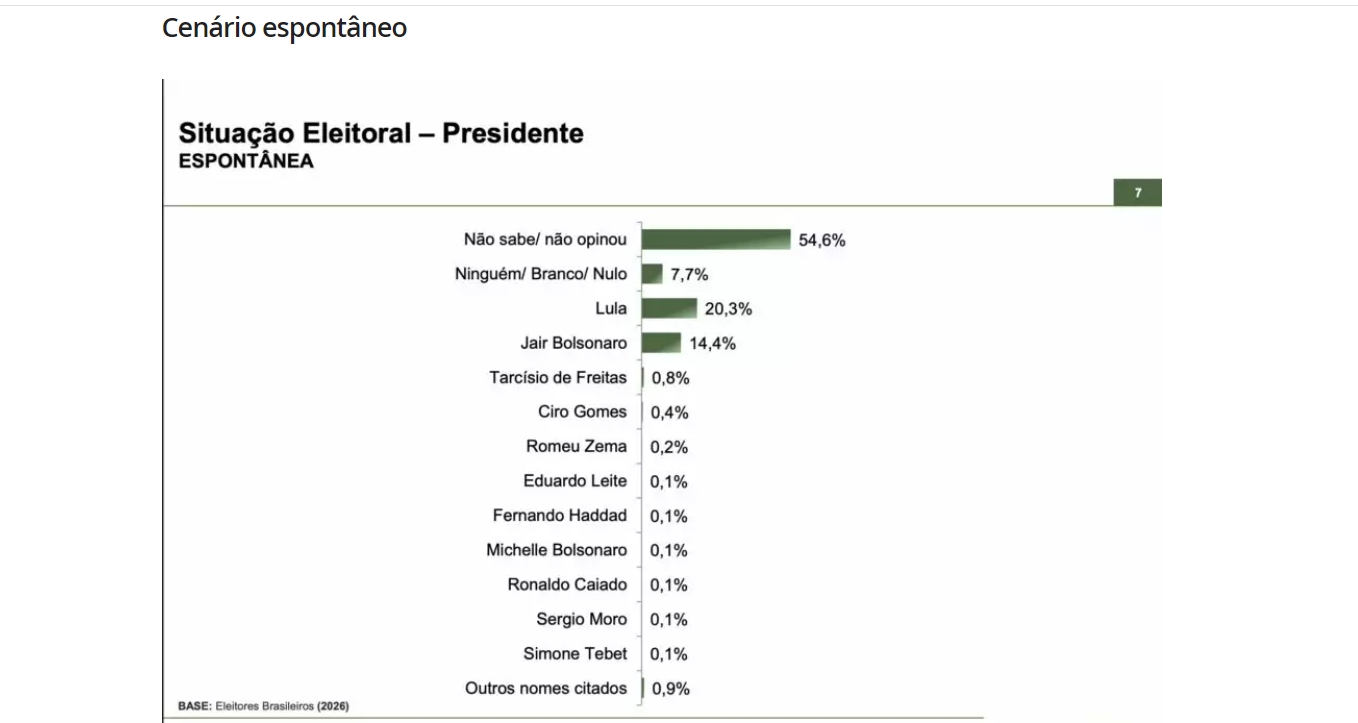 Lula tem 20,3% e Bolsonaro 14,4% no cenário espontâneo. Neste caso, os nomes dos candidatos são omitidos. A maioria (54,6%) não sabe ou não opinou, enquanto outros 7,7% optariam por votar branco/nulo, ou não votar se a eleição fosse hoje. Entre os demais nomes citados, o governador de São Paulo, Tarcísio de Freitas (Rep), é o destaque com 0,8% da preferência.