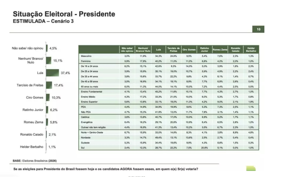 Lula lidera com 37,4% na disputa contra o governador Tarcísio (17,4%), onde Ciro Gomes tem 10,3%, o governador do Paraná, Ratinho Jr. (PSD) tem 6,2%, o governador mineiro Romeu Zema (Novo) tem 5,8%, o governador de Goiás, Ronaldo Caiado (União) aparece com 2,1% e o governador do Pará, Helder Barbalho ultrapassa 1% pela primeira vez na pesquia.