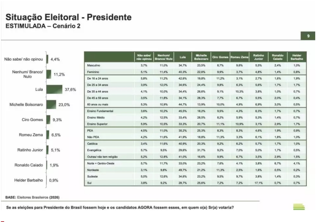 No cenário onde o principal candidato da oposição é Michelle Bolsonaro, Lula aparece com 37,6% e a ex-primeira-dama tem 23% dos votos, apesar de nunca ter disputado uma eleição. Ciro, que iria para a sua quinta disputa presidencial em 2026, aparece com 9,3%.