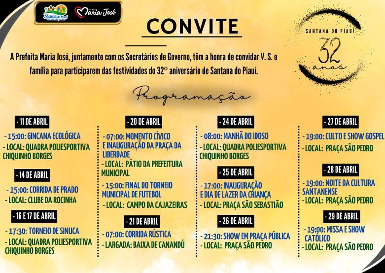 A Prefeitura de Santana do Piauí, por meio da prefeita Maria José, divulgou na tarde desta terça-feira, 26 de março, um convite oficial para a comemoração dos 32 anos de emancipação política e administrativa da cidade. A programação terá início no dia 11 de abril e segue até o dia 29 do mesmo mês, contando com diversas atrações para a população.