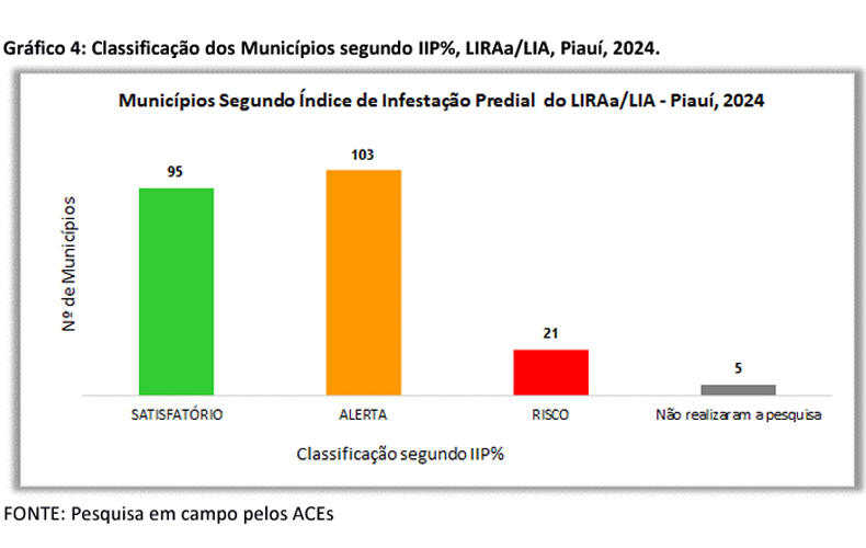 O Piauí tem 124 cidades sob alerta ou risco para surto/epidemia de dengue, é que o revelam os dados parciais do Levantamento Rápido de Índices para Aedes aegypti (LIRAa/LIA) consolidados no Boletim Epidemiológico divulgado nesta terça-feira (2) pela Secretaria de Estado da Saúde (Sesapi).
