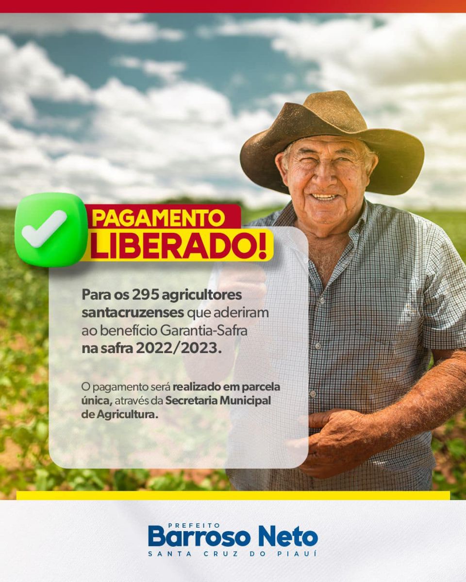 O prefeito de Santa Cruz do Piauí, Barroso neto (PT), anunciou em suas redes sociais que os agricultores do município inscritos no programa Garantia Safra já podem sacar o benefício.