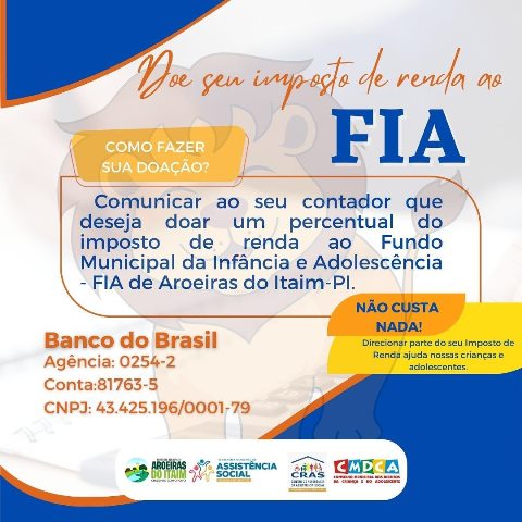 A Prefeitura de Aroeiras do Itaim deu início a uma campanha onde incentiva a população do município a dor parte do Imposto de Renda para o Fundo Municipal da Infância e Adolescência.