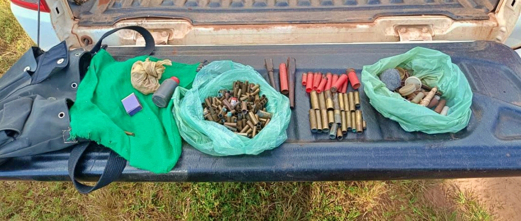 A PM afirmou que o mesmo usava arma de fogo para as ameaças e na averiguação no interior da casa, após autorização da vítima, foram encontradas duas espingardas e várias munições intactas de diversos calibres, além de centenas de cartuchos deflagrados de diferentes calibres, acessórios e armas brancas.