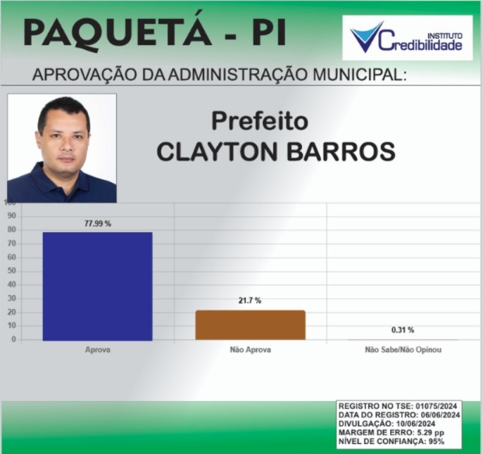 O Instituto ouviu 318 pessoas entre os dias 03 e 04 de junho deste ano. A pesquisa foi registrada no Tribunal Superior Eleitoral com sob o número PI 01075/2024, tendo como margem de erro 5,29% para mais ou para menos.