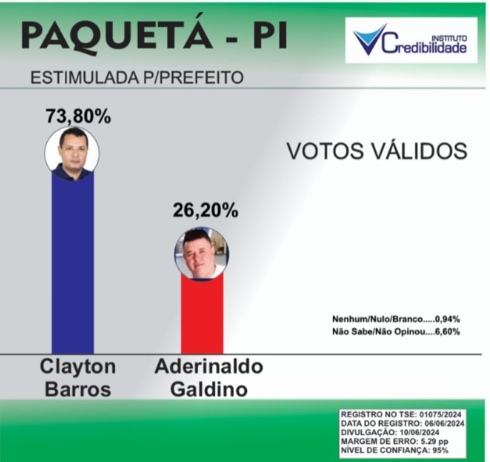 Nas intenções de votos válidos da pesquisa estimulada, DClayton Barros (PP) lidera com 73,80%, consolidando o favoritismo. O segundo colocado, Aderinaldo Galdino (MDB), obteve 26,20%. Os indecisos ou que não opinaram representam 6,60%, enquanto votos em branco ou nulos somam 0,94%.
