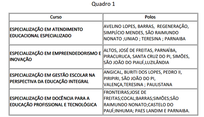 As vagas são distribuídas entre diversos polos, cada curso terá 50 vagas. Entre as cidades com cursos estão Teresina, Altos, Avelino Lopes, Barras, José de Freitas, Regeneração, São Raimundo Nonato, Parnaíba, Piracuruca, além de outros.