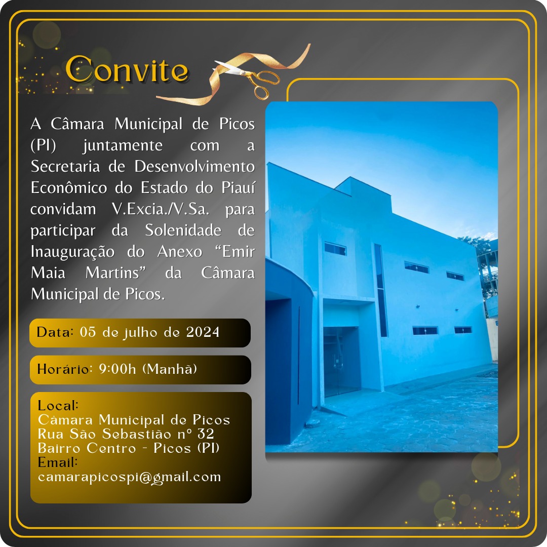 A Câmara de Vereadores de Picos inaugura nesta sexta-feira, 05, o anexo Emir Maia Martins. A obra teve inicio no ano passado e foi viabilizada através de recursos da Secretaria de Desenvolvimento Social e do Governo do Estado do Piauí, através de projeto do vereador Francisco das Chagas de Sousa, o Chaguinha.