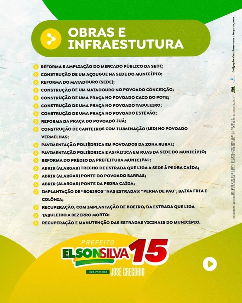 Confira abaixo todos os pontos do Plano de Governo apresentado na última sexta-feira (23), pelo candidato a prefeito da “Coligação Continuar com a força do Povo”.