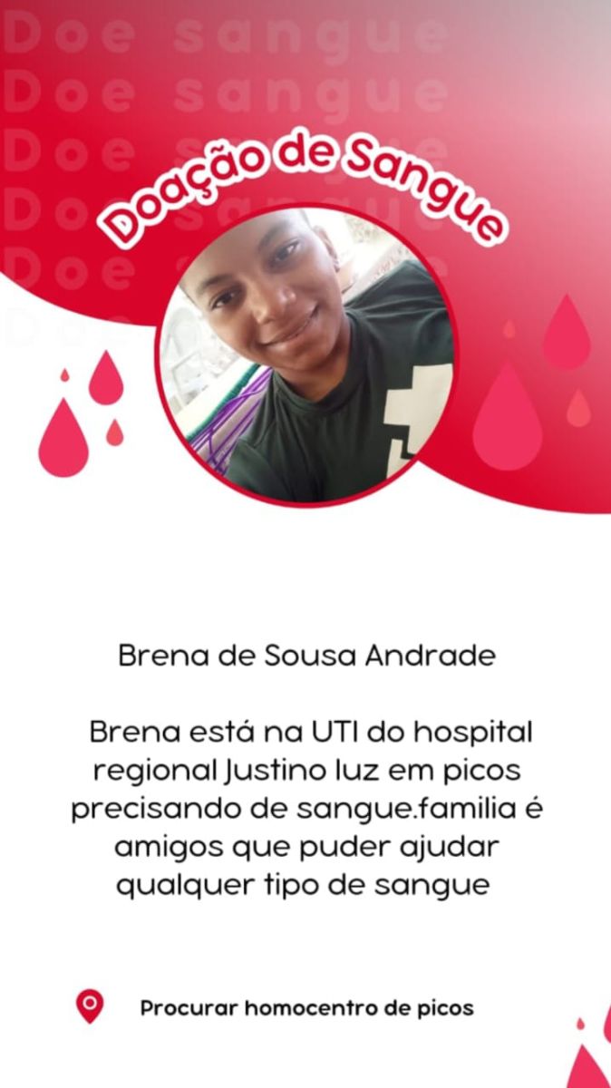 A família da jovem Branda de Sousa Andrade, de 21 anos, está realizando uma campanha de doação de sangue para o tratamento da jovem, que está internada no Hospital Regional Justino Luz, em Picos.
