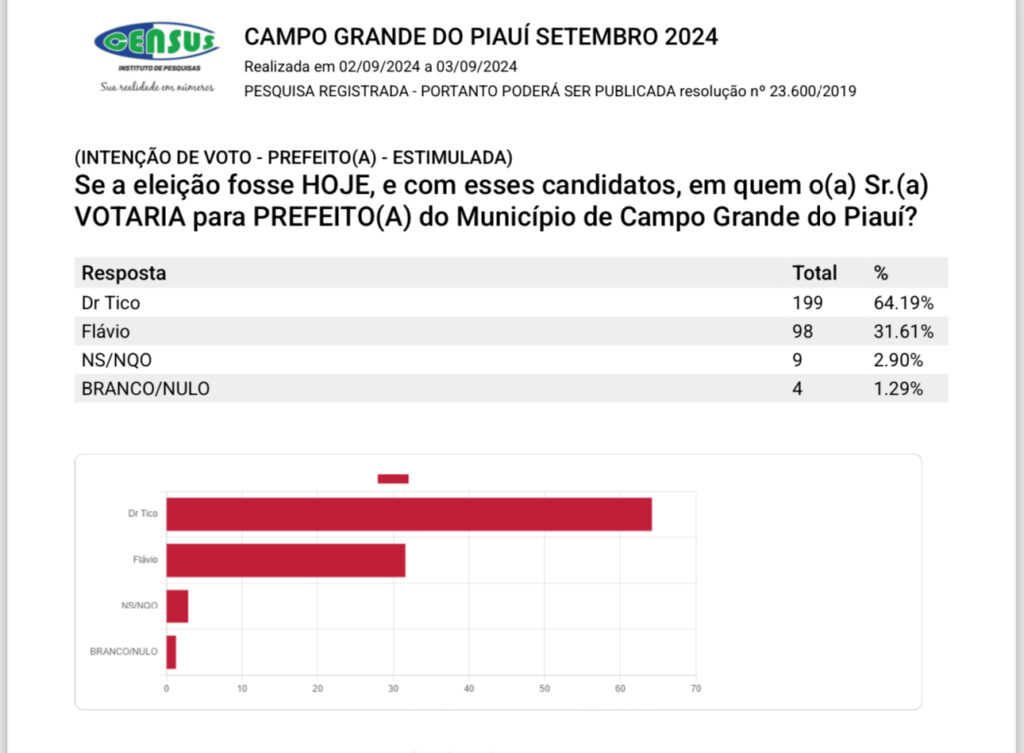 O Instituto Census divulgou os dados de uma nova pesquisa eleitoral realizada no município de Campo Grande do Piauí. O levantamento foi feito entre os dias 2 e 3 de setembro e ouviu 310 eleitores.
