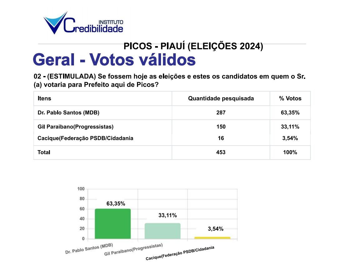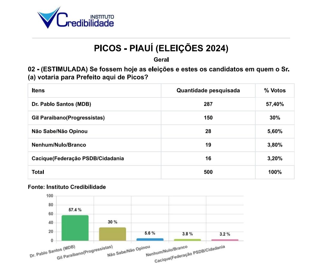 De acordo com o Instituto Credibilidade, na pesquisa estimulada, quando o entrevistador cita o nome dos três candidatos que estão concorrendo à prefeitura de Picos, Dr. Pablo Santos lidera a disputa com 57,40%. O atual prefeito e candidato a reeleição Gil Paraibano (PP), aparece em segundo lugar com 30%; e em terceira posição figura o candidato Cacique (Cidadania), com apenas 3,20% da preferência.