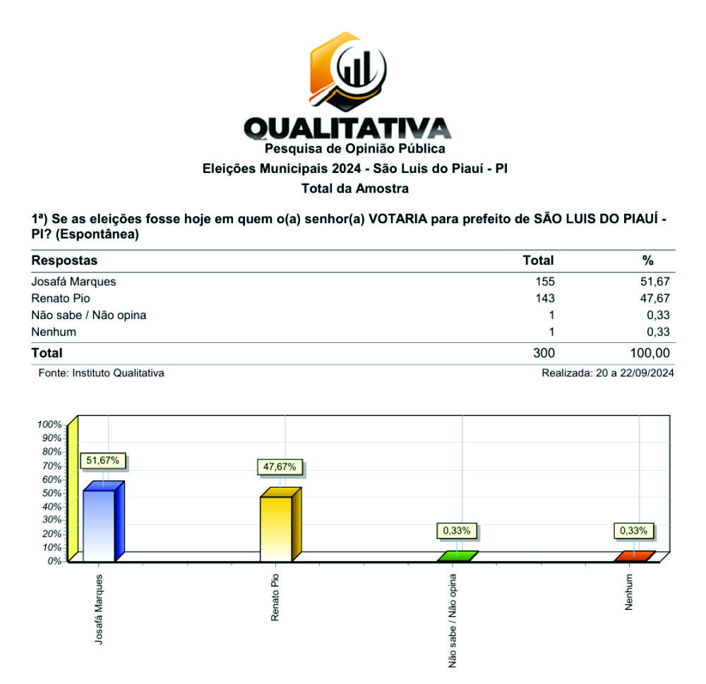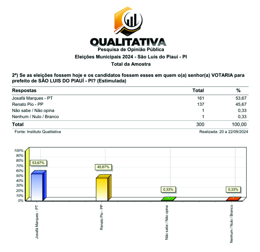 Uma nova pesquisa de intenções de voto para Prefeito de São Luís do Piauí realizada pelo Instituto Qualitativa e divulgada nesta segunda-feira, 30 de setembro, mostra o candidato Josafá Marques (PT) na liderança com 53,67% da preferência do eleitorado. Em segundo, o candidato Renato Pio (PP), aparece com 45,67%. Não sabe ou não opina somam 0,33%. Nenhum, nulo ou branco, 0,33%.