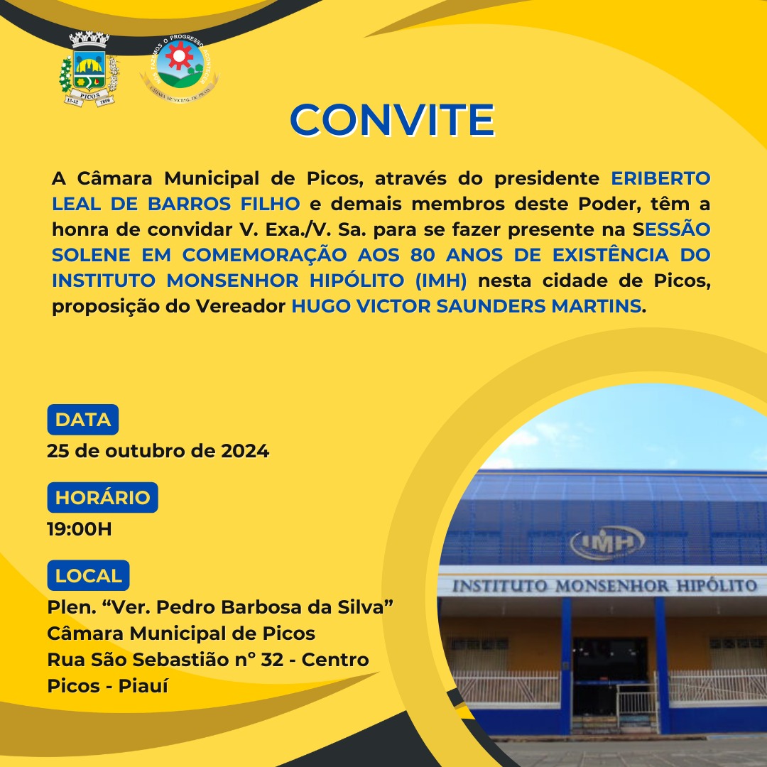 O presidente da Mesa Diretora da Câmara de Vereadores de Picos, Eriberto Barros (PSD), convida a toda sociedade picoense para participar de um Sessão Solene em comemoração aos 80 anos de existência do Instituto Monsenhor Hipólito (IMH).