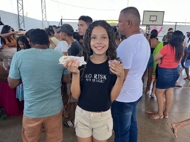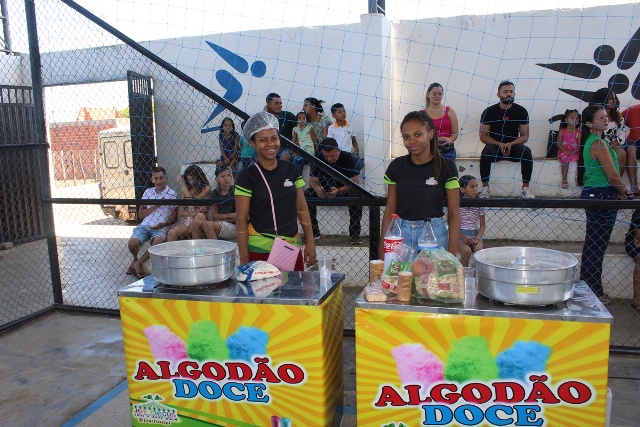 Para alimentar as crianças foram oferecidos lanches como Cachorro Quente e refrigerante, além de guloseimas como algodão doce, pipoca e picolé.