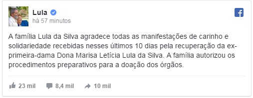 Lula e sua família autorizaram o procedimento de doação de órgãos após constatação de "ausência de fluxo cerebral". Em post no Facebook, o ex-presidente agradeceu às "manifestações de carinho e solidariedade".
