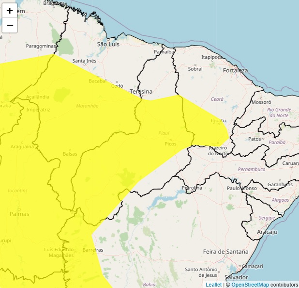 O Instituto Nacional de Meteorologia (INMET) emitiu alerta amarelo para possibilidade de chuvas para o Piauí. No mapa divulgado pelo instituto, as chuvas devem atingir 162 municípios nas regiões Centro-Norte, Sudeste e Sudoeste do estado.