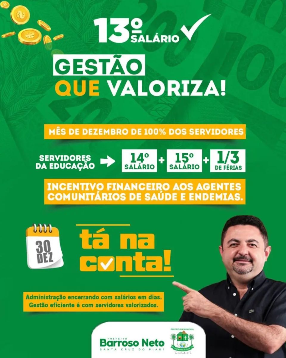 O prefeito de Santa Cruz do Piauí, Barroso Neto, anunciou em suas redes sociais que está encerrando seu mandato com as finanças municipais organizadas e os pagamentos dos servidores em dia. Em uma demonstração de compromisso com os servidores públicos municipais, Barroso destacou que o pagamento referente ao mês de dezembro foi concluído nesta segunda-feira, 30.