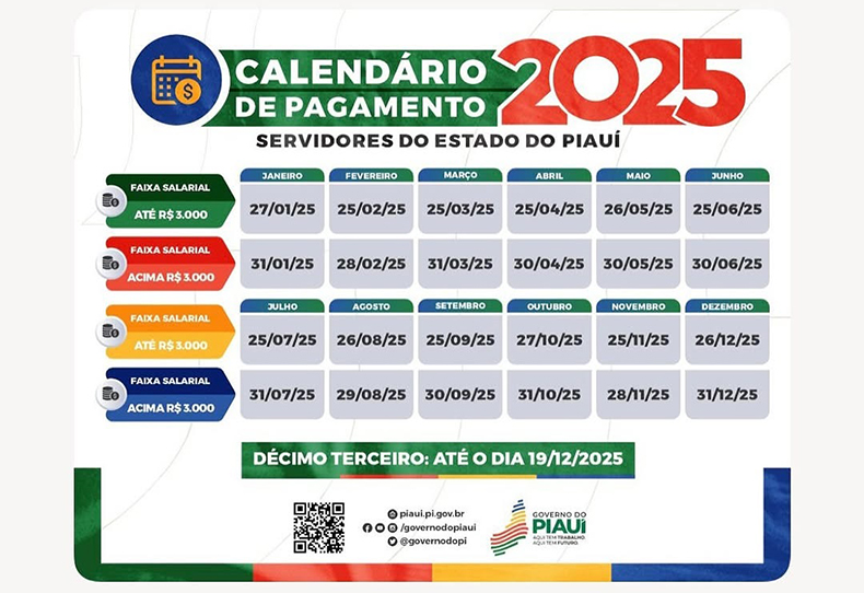 Todos os servidores receberão o salário ainda dentro do mês. O décimo terceiro salário será pago no dia 19 de dezembro de 2025.
