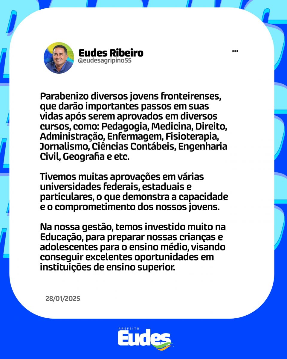 O prefeito de Fronteiras, Eudes Ribeiro, parabenizou os jovens fronteirenses que conquistaram aprovação em diversas universidades do país. Em mensagem divulgada nesta semana, Eudes, destacou o empenho e a dedicação dos estudantes que ingressaram em cursos como Pedagogia, Medicina, Direito, Administração, Enfermagem, Fisioterapia, Jornalismo, Ciências Contábeis, Engenharia Civil e Geografia, entre outros.