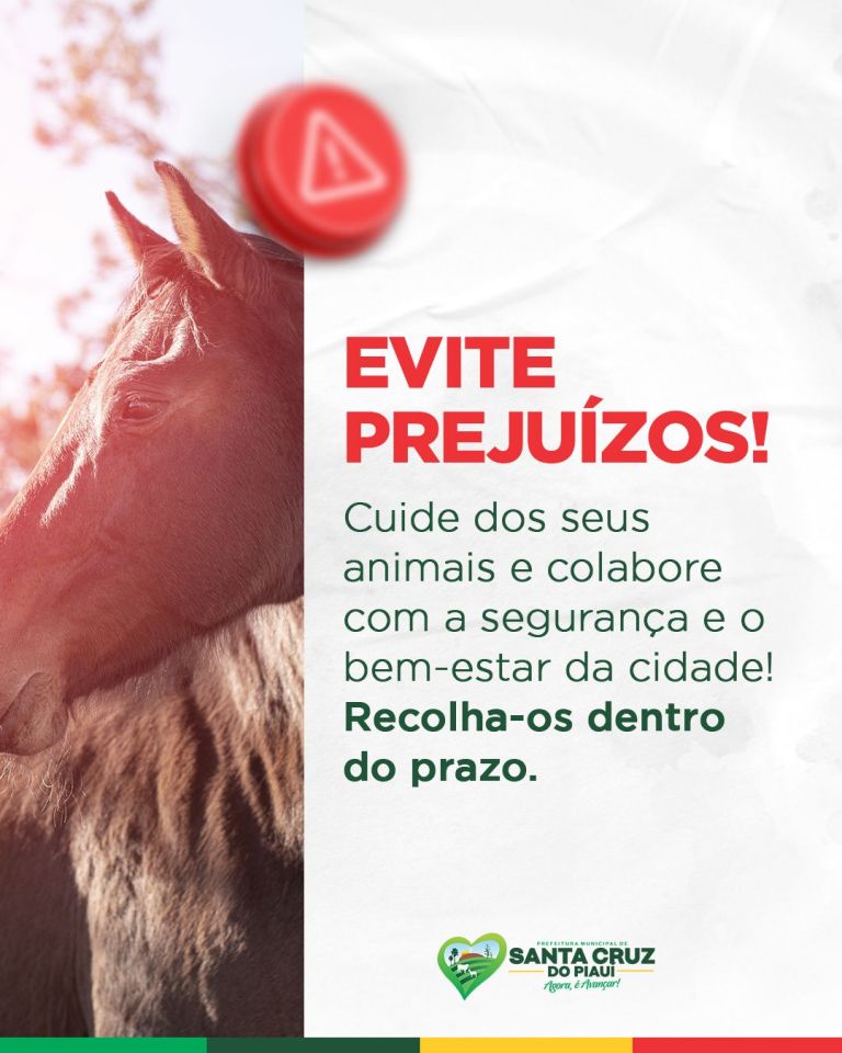 A Prefeitura de Santa Cruz do Piauí emitiu um comunicado direcionado aos proprietários de animais, alertando para a necessidade de recolherem os bichos que estiverem soltos em vias públicas até o próximo sábado, 12 de abril de 2025.