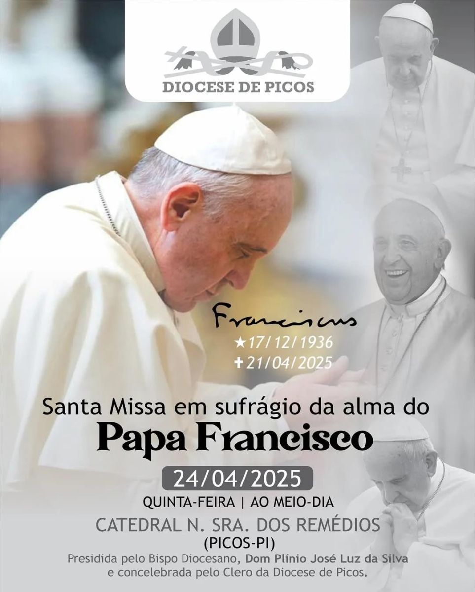 A Diocese de Picos celebrará, ao meio-dia da próxima quinta-feira (24), uma missa em sufrágio pela alma do Papa Francisco, falecido na madrugada desta segunda-feira (21), aos 88 anos, na Itália. A celebração ocorrerá na Igreja Catedral de Nossa Senhora dos Remédios e será presidida pelo bispo diocesano Dom Plínio, com a participação de membros do clero local.