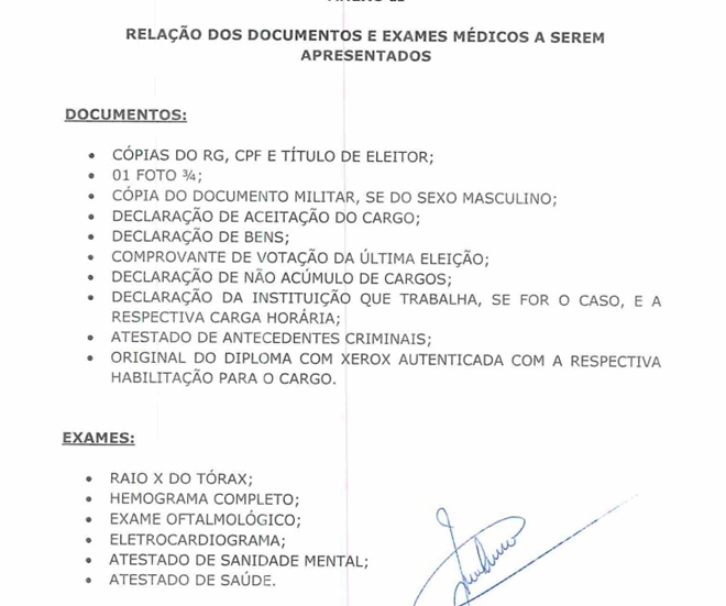 Após a realização dos exames e sua devida homologação pela Junta Médica, os candidatos deverão comparecer a Secretária de Administração, localizada na Prefeitura Municipal, em posse da documentação exigida (foto abaixo) no período de 20 a 24 de março, nos horários de 08h00 às 12h00 e de 14h00 as 17h00.