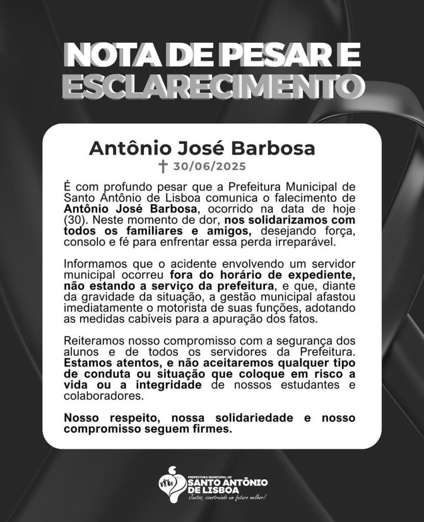 A Prefeitura de Santo Antônio de Lisboa confirmou, por meio de nota, que o motorista é servidor público municipal, mas que não estava a serviço no momento do acidente. O funcionário foi afastado, e a gestão informou que “está adotando todas as medidas administrativas e legais cabíveis para a apuração dos fatos”.