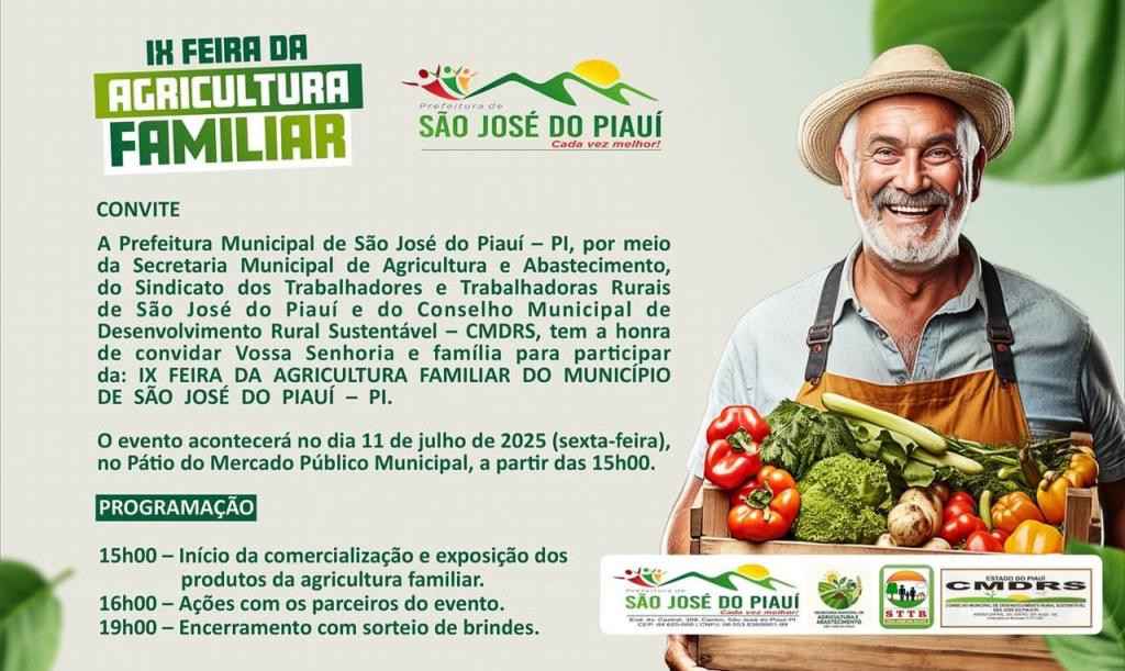 O município de São José do Piauí se prepara para mais uma celebração da força e da tradição do campo com a realização da IX Feira da Agricultura Familiar, marcada para o próximo dia 11 de julho, a partir das 15h, no Pátio do Mercado Público Municipal. O evento, promovido pela Prefeitura, é um convite à valorização dos produtores rurais e da economia local.