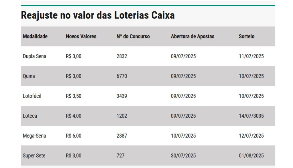 As apostas das Loterias Caixa aumentam a partir de 9 de julho. O reajuste atinge as modalidades Dupla Sena, Quina, Lotofácil, Mega-Sena, Loteca e Super Sete.